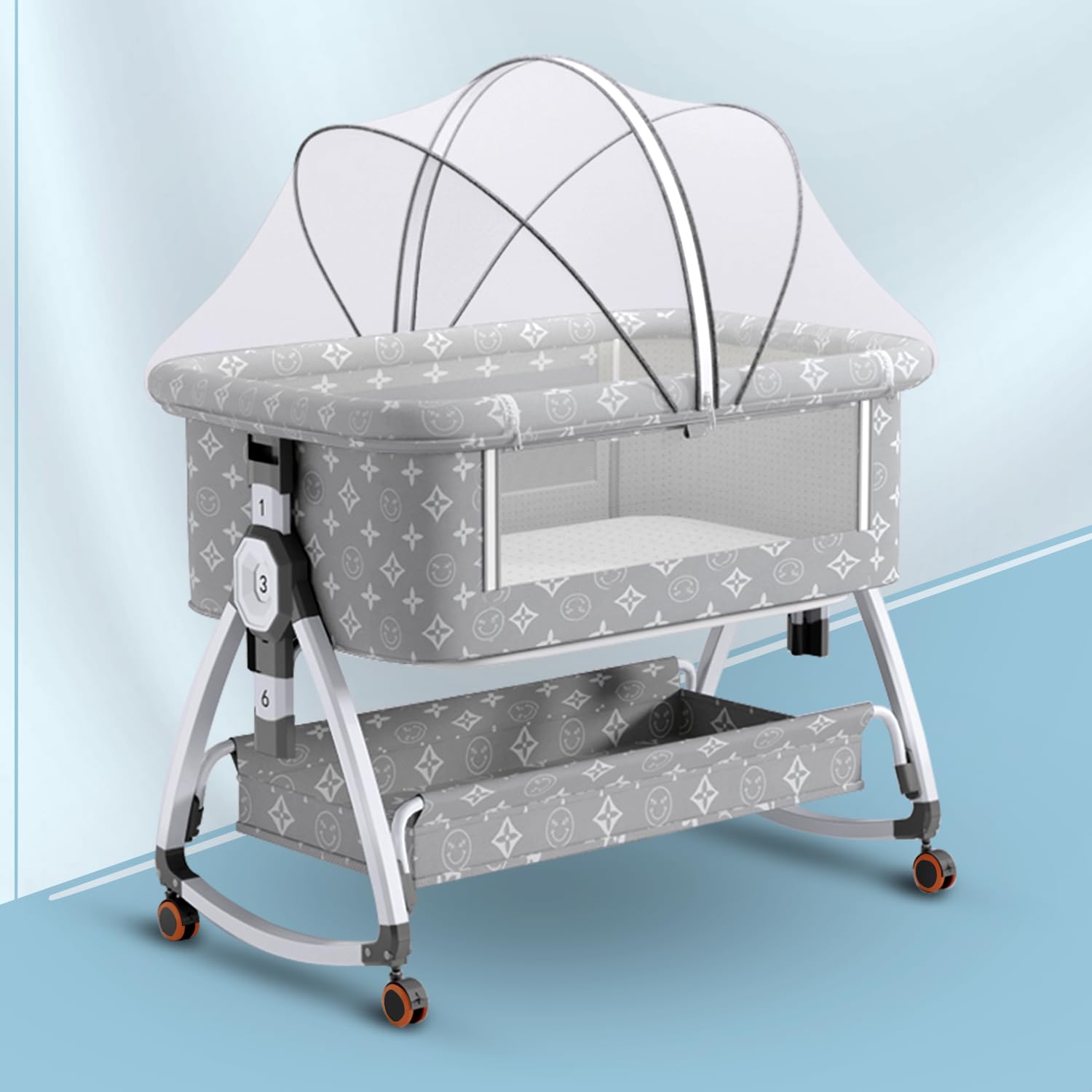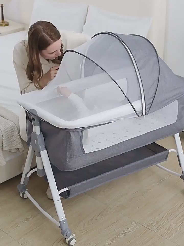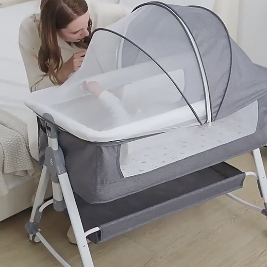 Ova svestrana kolevka nudi praktičnu funkcionalnost 6-u-1, prilagođavajući se potrebama vaše bebe. Izrađena je od robusnog avio aluminijuma sa prozračnim mrežastim stranama koje osiguravaju bezbednost i optimalan protok vazduha. Šest podesivih nivoa visine i okretni točkići sa kočnicama omogućavaju lako pozicioniranje pored roditeljskog kreveta i premeštanje. Dodatno, uklonjiva korpa za odlaganje i mogućnost ljuljanja čine je izuzetno praktičnim rešenjem za roditelje.