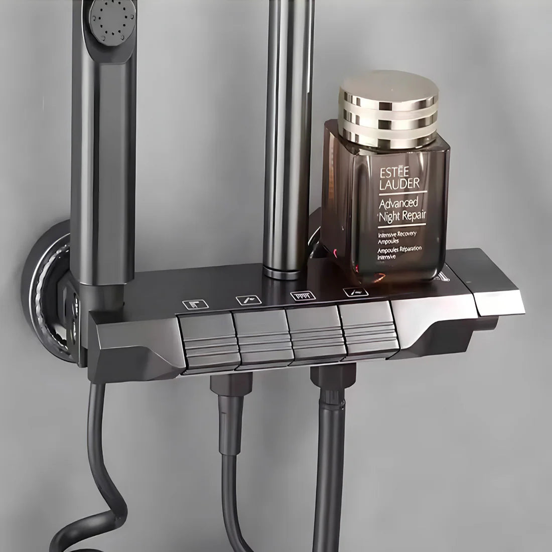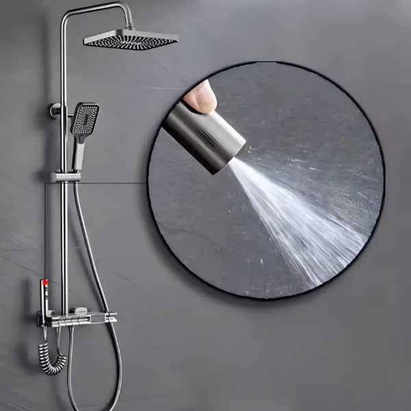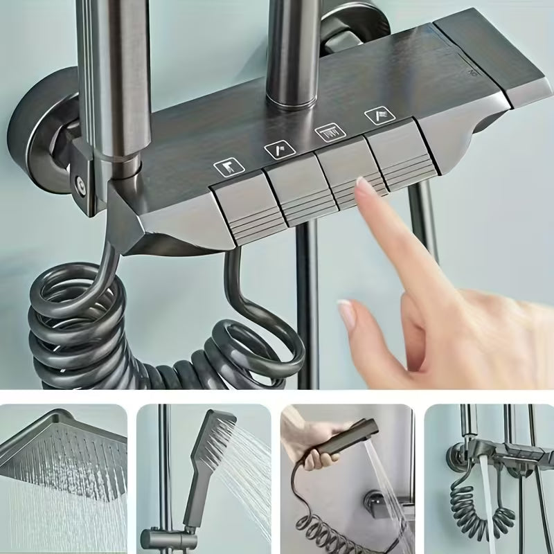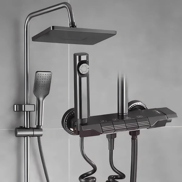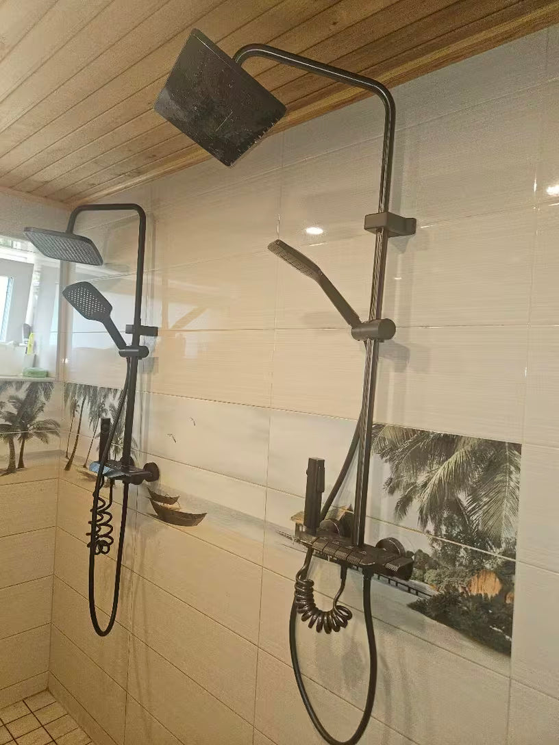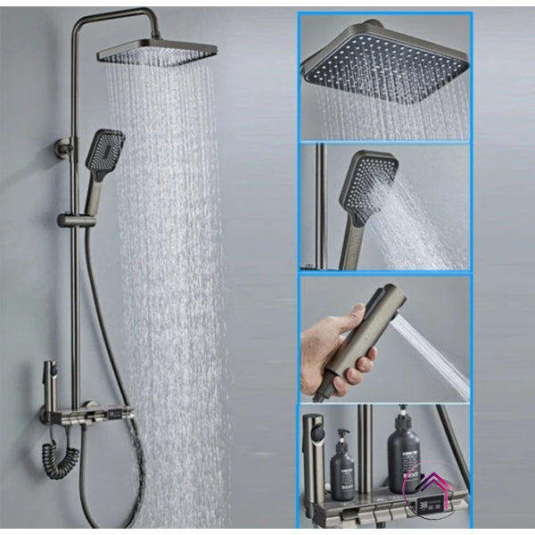 Doživite savršenstvo tuširanja uz"Verano" digitalni tuš sistem koji pruža preciznu kontrolu temperature vode na modernom LED displeju. Inovativni tasteri u stilu klavira čine prebacivanje između kišnog i ručnog tuša izuzetno lakim i intuitivnim. Ovaj elegantni dizajn, upotpunjen praktičnom policom, pretvara Vaše kupatilo u luksuzni spa centar.
